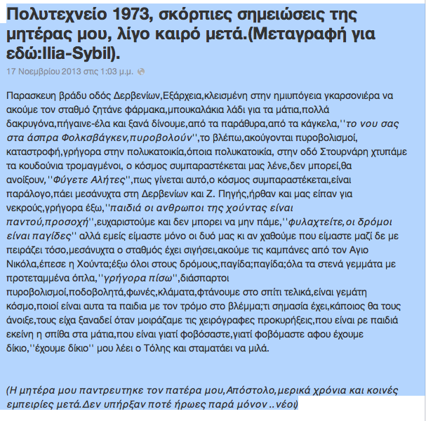 – δεν μιλώ για το "κτήνος" της Χρυσής Αυγής, η οποία τις προάλλες βγήκε και είπε πως δεν υπήρξαν νεκροί στο Πολυτεχνείο. Ακόμη κι η ίδια η Χούντα τότε είχε ανακοινώσει 21 νεκρούς.