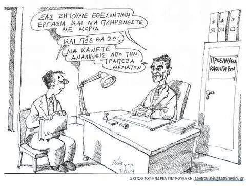 Μέσα στο πνεύμα του εθελοντισμού και προφανώς για να δώσει κι ένα μάθημα ζωής στους νέους (παιδεία ειναι αυτή όχι παίξε-γέλασε), προτείνει σε όποιον εκπαιδευτικό θέλει να μαζέψει μόρια αναμένοντας την τυχόν μελλοντική του πρόσληψη να προσφέρει εθελοντικά την εργασία του για να συμπληρωθούν οι 1100 καθηγητές που του λείπουν...!!!!